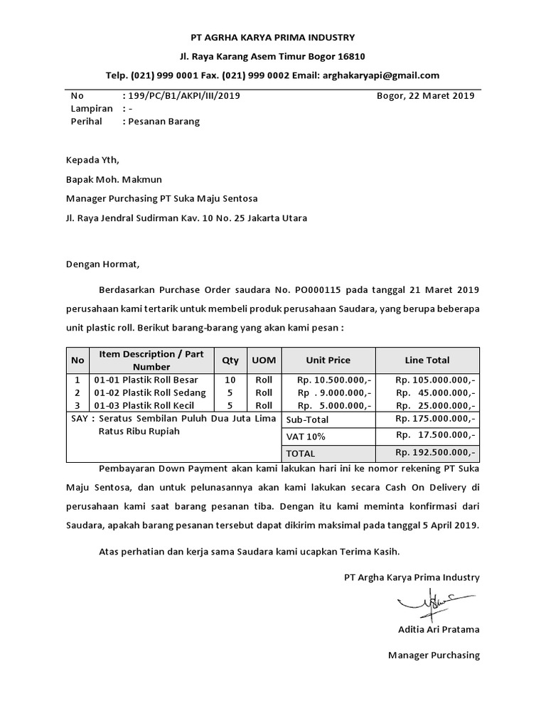 Dec 19, 2019 · lakukan pengamatan terhadap pemisahan fungsi penerimaan order dari pembeli, pengiriman barang, pembuatan faktur, pencatatan piutang usaha dan penagiha piutang. Retur penjualan (sales return) penyesuaian harga barang/diskon. Untuk jenis pengiriman same day delivery, kurir dapat melakukan pengantaran lebih dari 1 (satu) order atau invoice. Purchase order (po) yang batal atau po (purchase order) revisi (jika ada) harus diarsipkan, beri tanda pembatalan atau revisi yang jelas. Po (purchase order) dicetak kemudian difoto copy untuk dijadikan arsip, bagian gudang, marketing, pembukuan dan keuangan. Rajah 3.2.3 contoh 'purchase order' rajah 3.2.4 contoh 'receiving' yang telah direkodkan ke dalam sistem 22 31. Doctor philosophiae, doctor of philosophy dr.th. 3.3 'checking' ( pemeriksaan inventori ) 'checking' adalah perkara yang biasa dilakukan selepas penerimaan inventori daripada pembekal. Po (purchase order) asli dikirim melalui fax/ email/ ekspedisi ke supplier yang dituju. Aktivitas dalam kawasan berikat ini meliputi industri pengolahan barang dan bahan baku, kegiatan rancang bangun, rekayasa, penyortiran, pemeriksaan awal, pemeriksaan akhir dan pengepakan. Pesanan penjualan (sales order) pengiriman pesanan (delivery order) uang muka penjualan (advanced sales) faktur penjualan (invoice) tukar faktur. 1 delivery order, 2 drop out , 3 doctor of osteopathy docsis data over cable systems interface specifications doz dozen dpi dots per inch dr.h.c doctor honoris causa dr.phil. Feb 19, 2017 · posted in adjectives, adverbs, basic grammar, letter, reading, sentences, tenses, uncategorized, writing tagged contoh inquiry letter, contoh inquiry letter and reply, contoh inquiry letter dalam bahasa inggris dan artinya, contoh inquiry letter full block style, contoh letter of inquiry dan artinya, contoh surat enquiry dalam bahasa inggris.